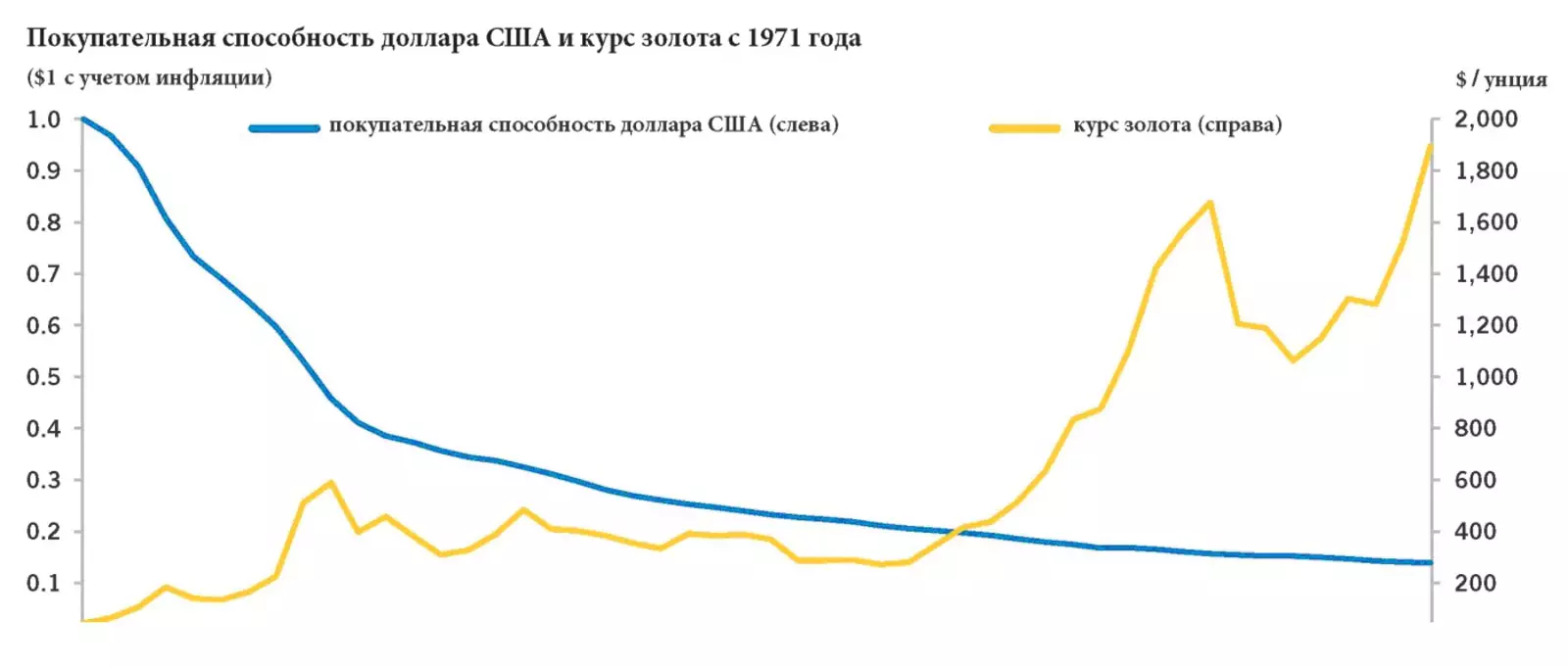 Как изменилось отношение доллара к курсу золота за указанный период? Унция драгметалла подорожала в 51 раз относительно американской валюты (с 35 до 1800 долларов за унцию).Среднегодовой темп прироста курса золота с 1971 года равен 8%. Это свидетельствует о том, что доллар потерял львиную долю своей покупательной способности, а золото стало играть роль чуть ли не единственного эффективного защитного актива на рынке (см. график внизу). Поэтому неудивительно, что центральные банки, индивидуальные и институциональные инвесторы охотно приобретают тысячи тонн золота ежегодно для защиты своих капиталов от инфляции и кризисов.