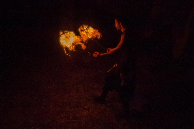 Также в представлении участвовал импровизированный «огнемёт», сделанный из баллона с пропаном и шланга, закреплённого на муляже футуристического ружья. Дожигая пропан за сценой, артисты умудрились подпалить сухую траву, но оперативно затаптывали возгорание.