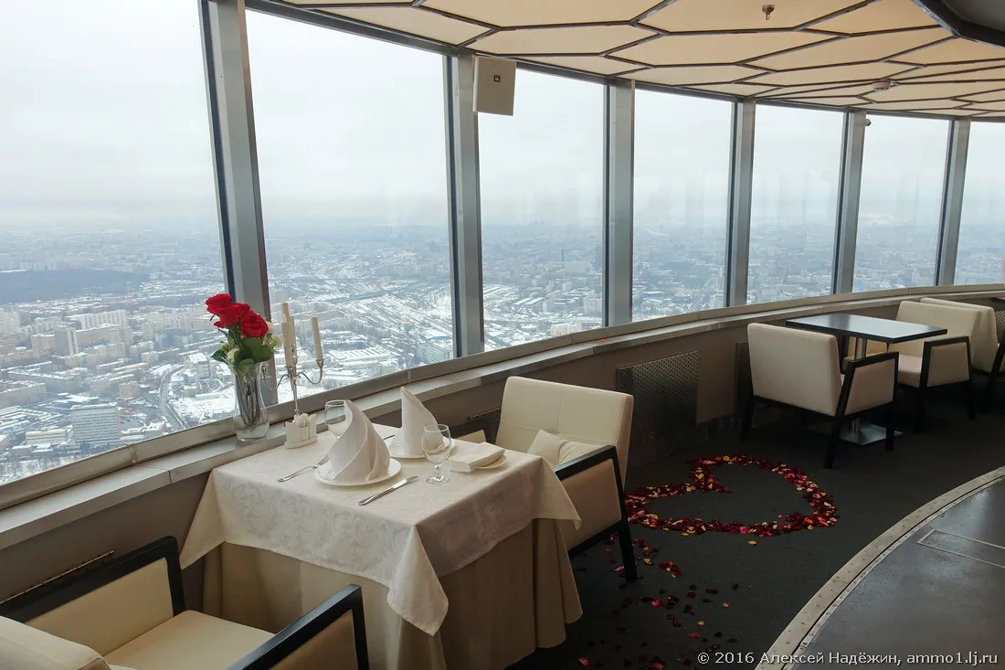 Таким ресторан был в 2016 году. Сейчас работает только кафетерий на отметке 334 метра (туда могут спуститься все желающие), а кафе и ресторан закрыты.