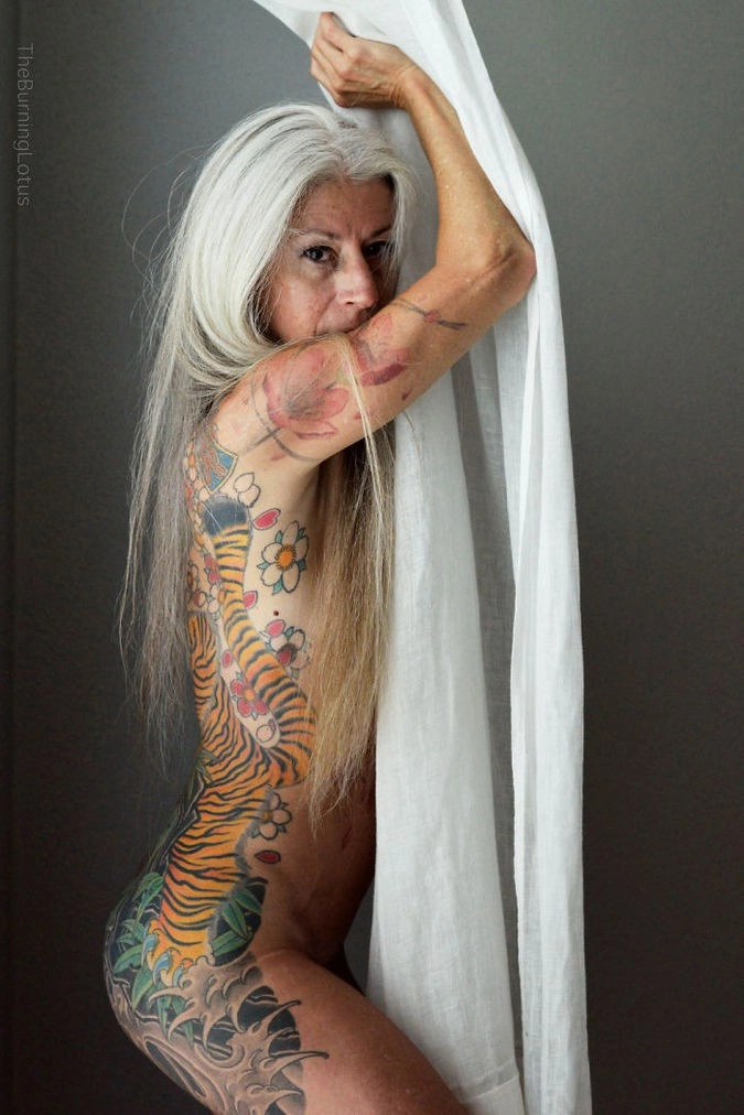 Цветная татуировка на всю спину, пирсинг на интимных местах, длинные белые волосы: снимки Джулии очень провокационные. На tumblr она успела стать местной знаменитостью, популярность её странички продолжает набирать обороты, а фотографии становятся всё откровеннее. «Работайте над собой, чтобы стать лучшим человеком, любите себя и не бойтесь быть совершенно несовершенными», — советует 56-летняя Джулия своим поклонникам.