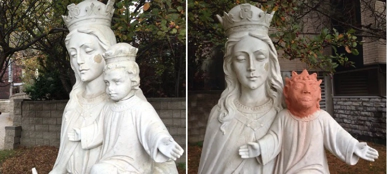 В канадском городе Садбери вандалы надругались над скульптурой Девы Марии и младенца Иисуса. Ребёнку отбили голову и унесли. Слепить новую голову для статуи вызвалась местная художница Хизер Уайз. И слепила. Только не ангелоподобного Иисуса, а то ли Чужого, то ли Йодо. Результат работы шокировал весь город, а потом и весь мир. Однако от вида чудовищный головы землистого цвета сердце дрогнуло даже у вора, и он принёс настоящую голову младенца обратно. Сейчас скульптура восстановлена.