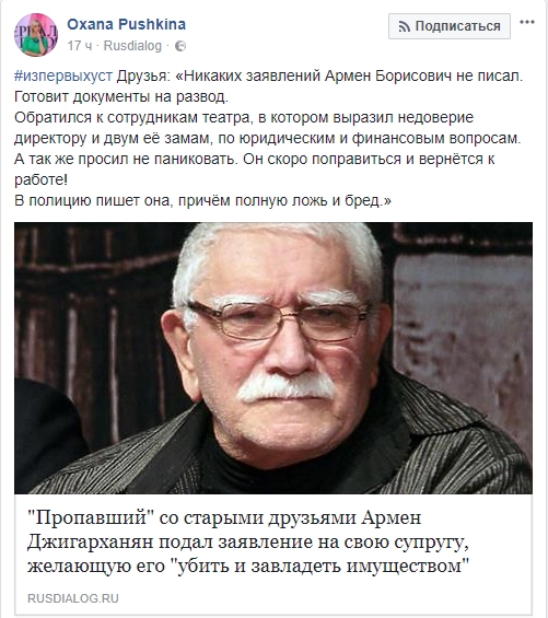 «Никаких заявлений Армен Борисович не писал. Готовит документы на развод., — написала ведущая в Facebook, сославшись на друзей режиссера. — Обратился к сотрудникам театра, в котором выразил недоверие директору и двум её замам по юридическим и финансовым вопросам. А также просил не паниковать».