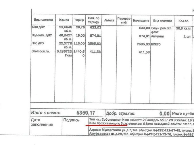 1. Проверьте вашу платежку, обратив внимание на количество проживающих (подчеркнутая на картинке часть).