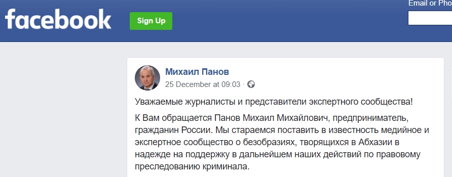 Панов разместил в интернете жалобу на абхазские криминальные круги, «в том числе из руководства Абхазии», которые отняли у него личный трубный завод.