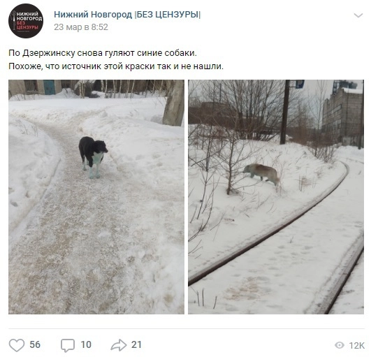 Эксперты нижегородского НИИ химии провели анализ шерсти голубых собак и установили, что они вывалялись в краске «берлинская лазурь». Этот краситель безвреден для организма животных, но у него есть существенный недостаток — он не отчищается.
