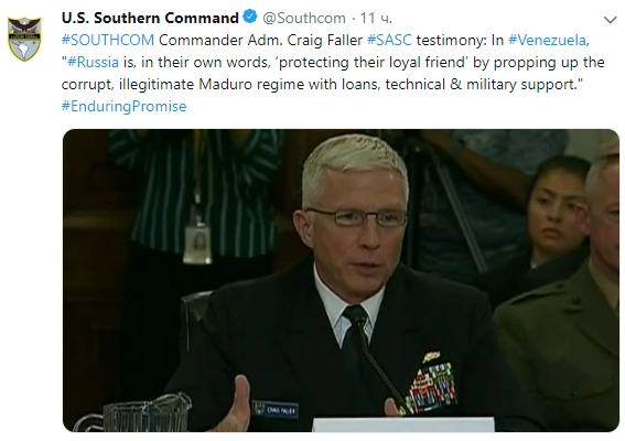 В Венесуэле присутствуют сотни российских военных, заявил глава Южного командования вооруженных сил США адмирал Крейг Фоллер во время выступления на слушаниях в Комитете по вооруженным силам Сената США.