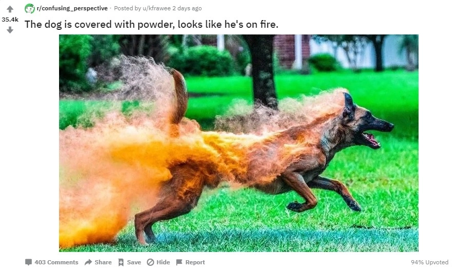 В интернете обсуждают фотографию собаки, которая бежит по траве, как будто объятая пламенем. На самом деле пса покрывает цветной порошок. Однако оптическая иллюзия настолько реалистичная, что на первый взгляд, кажется, что собака горит.