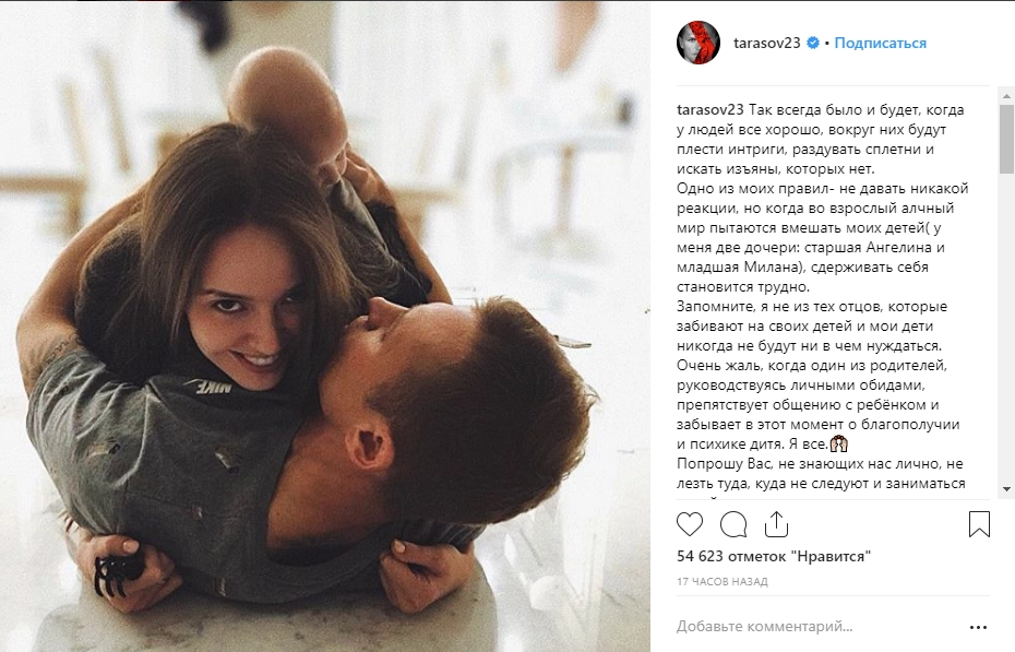 Запомните, я не из тех отцов, которые забивают на своих детей, и мои дети никогда не будут ни в чем нуждаться. Очень жаль, когда один из родителей, руководствуясь личными обидами, препятствует общению с ребенком и забывает в этот момент о благополучии и психике дитя. Я всё, — написал Тарасов.