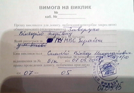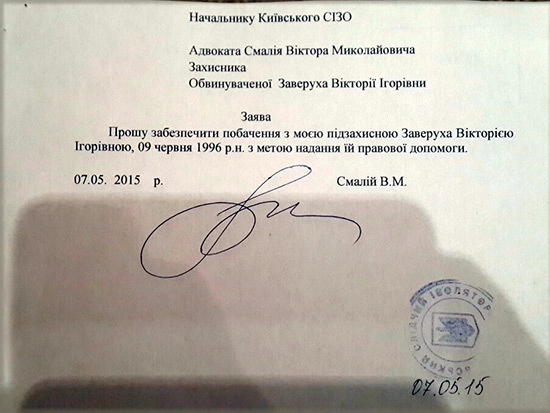 «Сегодня ночью, 8 мая 2015 года, адвокат Виктор Смалий пытался встретиться с Витой. Но, милиция, зная, что придет Смалий, спрятала задержанную. Поначалу, в ИТТ заявили, что Заверуху перевели в СИЗО. Когда Виктор Смалий приехал в СИЗО, там сообщили, что та находится в ИТТ. А в ИТТ ее отказываются показывать. Известно, что вчера Виту Заверуху возили на следственный эксперимент по убийству Бузины. Согласилась ли она участвовать в этом, или нет — точно не известно. К ней умышленно не допустили адвоката Смалия и назначали государственных адвокатов, которые делают то, что нужно милиции. Завтра, Смалий будет снова пытаться встретиться с Витой», — сказано в сообщении «Дорожного контроля».
