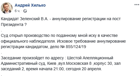 Иск об отмене регистрации кандидата на пост президента Украины Владимира Зеленского будет сегодня рассмотрен Шестым апелляционным административным судом, написал Хилько на своей странице в Facebook.