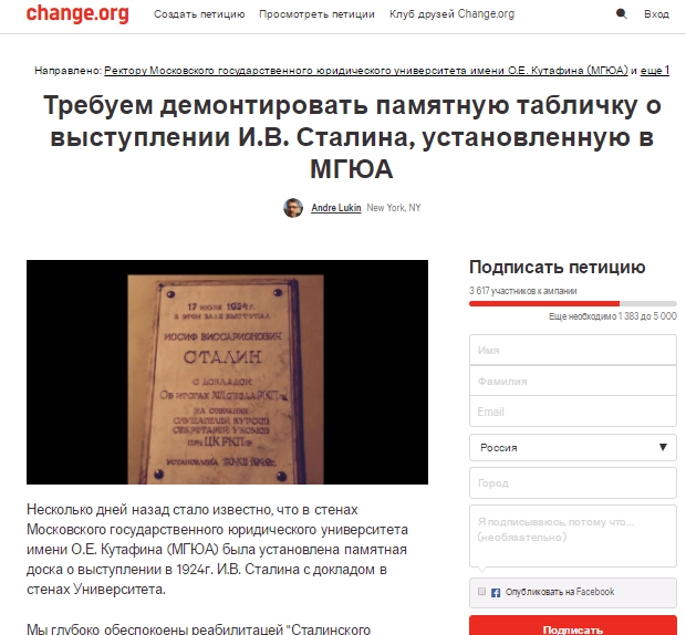 Тем временем, на сайте change.org появилась петиция с требованием убрать мемориальную табличку из вуза. На момент публикации ее подписали более 3,5 тысяч человек.