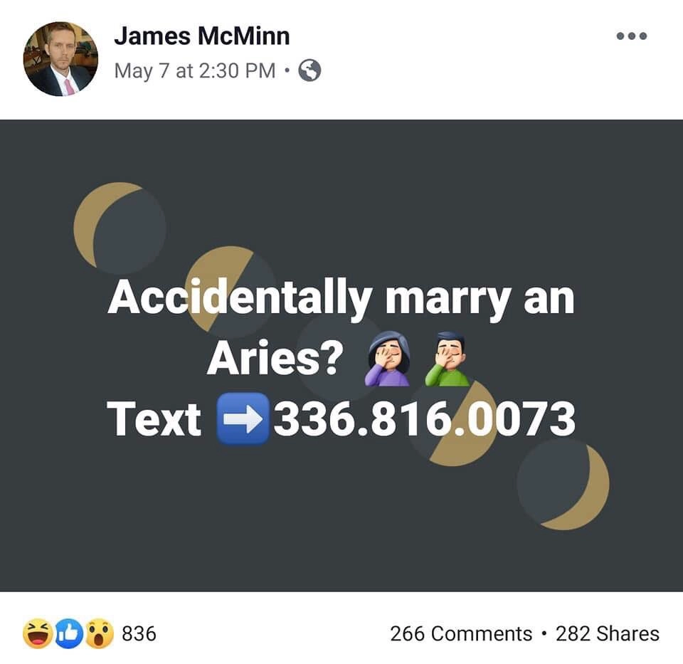 В соцсетях смеются над остроумной рекламой адвоката по разводам Джеймса МакМинна (James McMinn) из Северной Каролины. Юрист вовсю использует мемы, опасные шутки и чёрный юмор. Забавные публикации американца опубликовала в своём Twitter микроблогерша Элизабет Сампат (Elizabeth Sampat). И пост быстро стал популярным, собрав 108 тысяч лайков и почти 40 тысяч ретвитов.