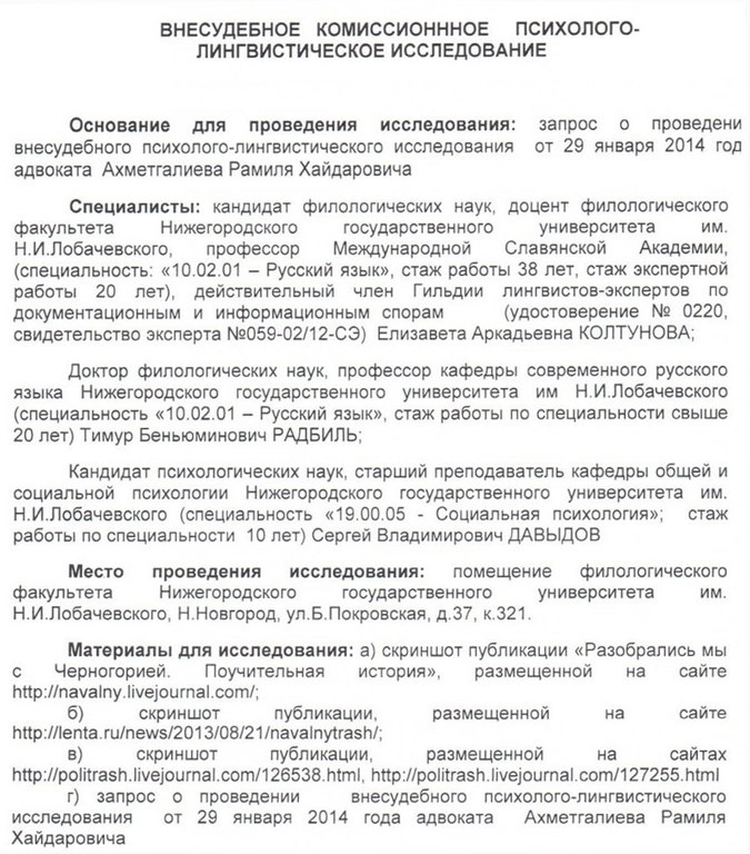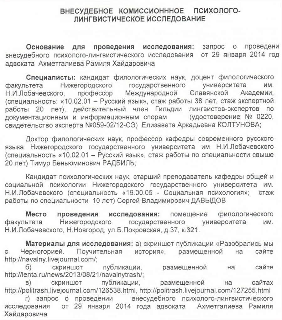 На сайте Ruposters.Ru были опубликованы материалы внесудебного комиссионного психолого-лингвистического исследования, на которые в ходе заседания ссылалась защита Навального. Согласно их содержанию, после прочтения новости о собственной фирме в Черногории на портале Lenta.ru Навальный перенес тяжелую психологическую травму, которая нарушила его психическую деятельность.