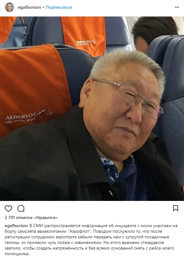 «В СМИ распространяется информация об инциденте с моим участием на борту самолета авиакомпании „Аэрофлот“. Поводом послужило то, что после регистрации сотрудники аэропорта забыли передать нам с супругой посадочные талоны, их принесли чуть позже с извинениями. Но этого времени стюардессе хватило, чтобы создать напряженность и без всяких оснований снять с рейса моего помощника. Случаи неподобающего поведения бортпроводников „Аэрофлота“ в отношении пассажиров из Якутии случались и ранее. Поручил аппарату правительства республики дать всеобъемлющую и объективную юридическую оценку действиям экипажа и стюардессы, при необходимости подготовить исковое заявление», — написал он в Instagram.