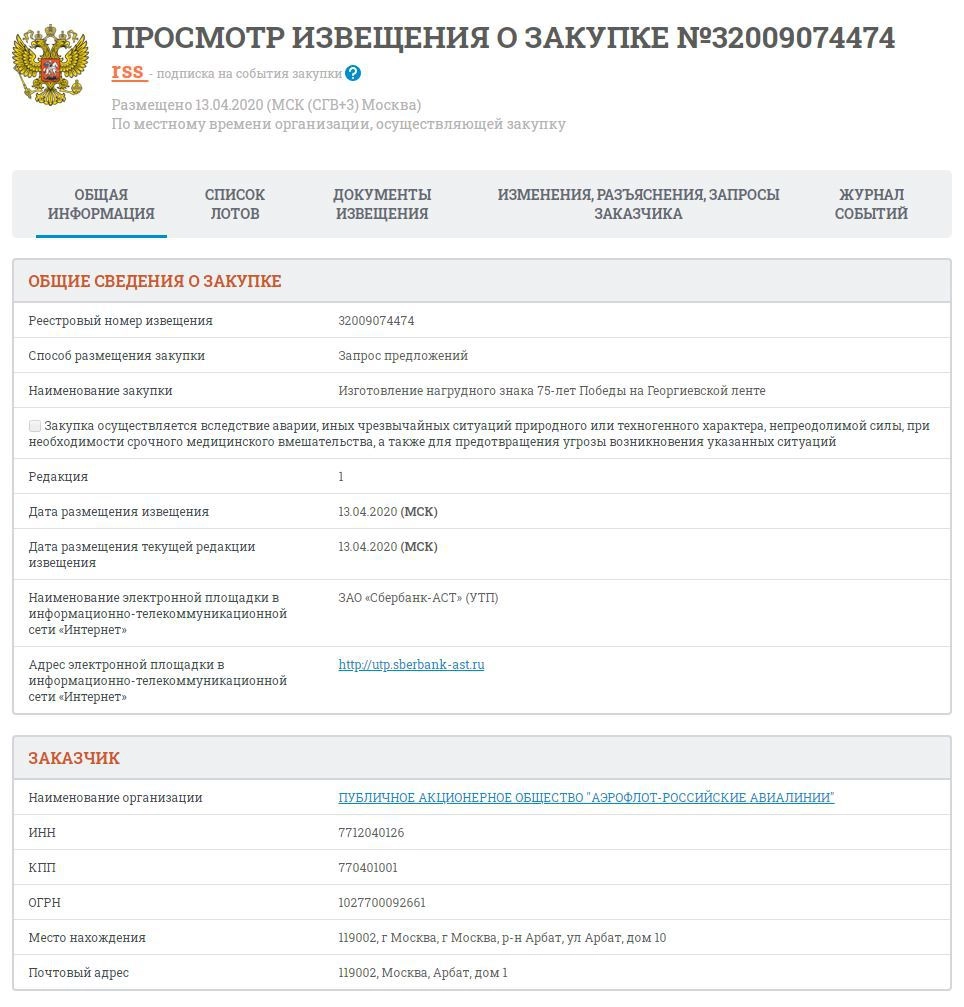 Авиакомпания «Аэрофлот» разместила в Единой информационной системе закупок заказ на 15 тысяч нагрудных знаков «75 лет Победы» общей стоимостью 3,4 миллиона рублей.