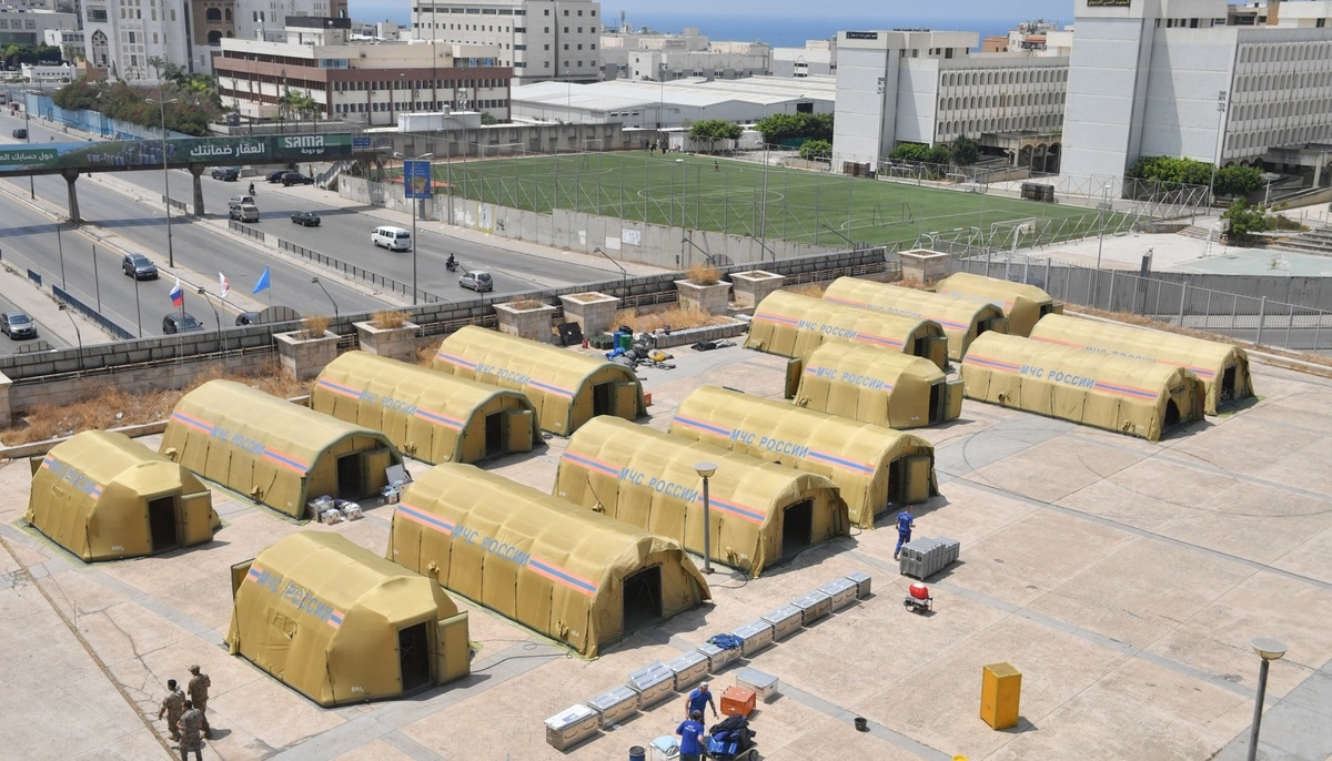 На стадионе вблизи зоны ЧС в Бейруте развернут аэромобильный госпиталь МЧС РФ.