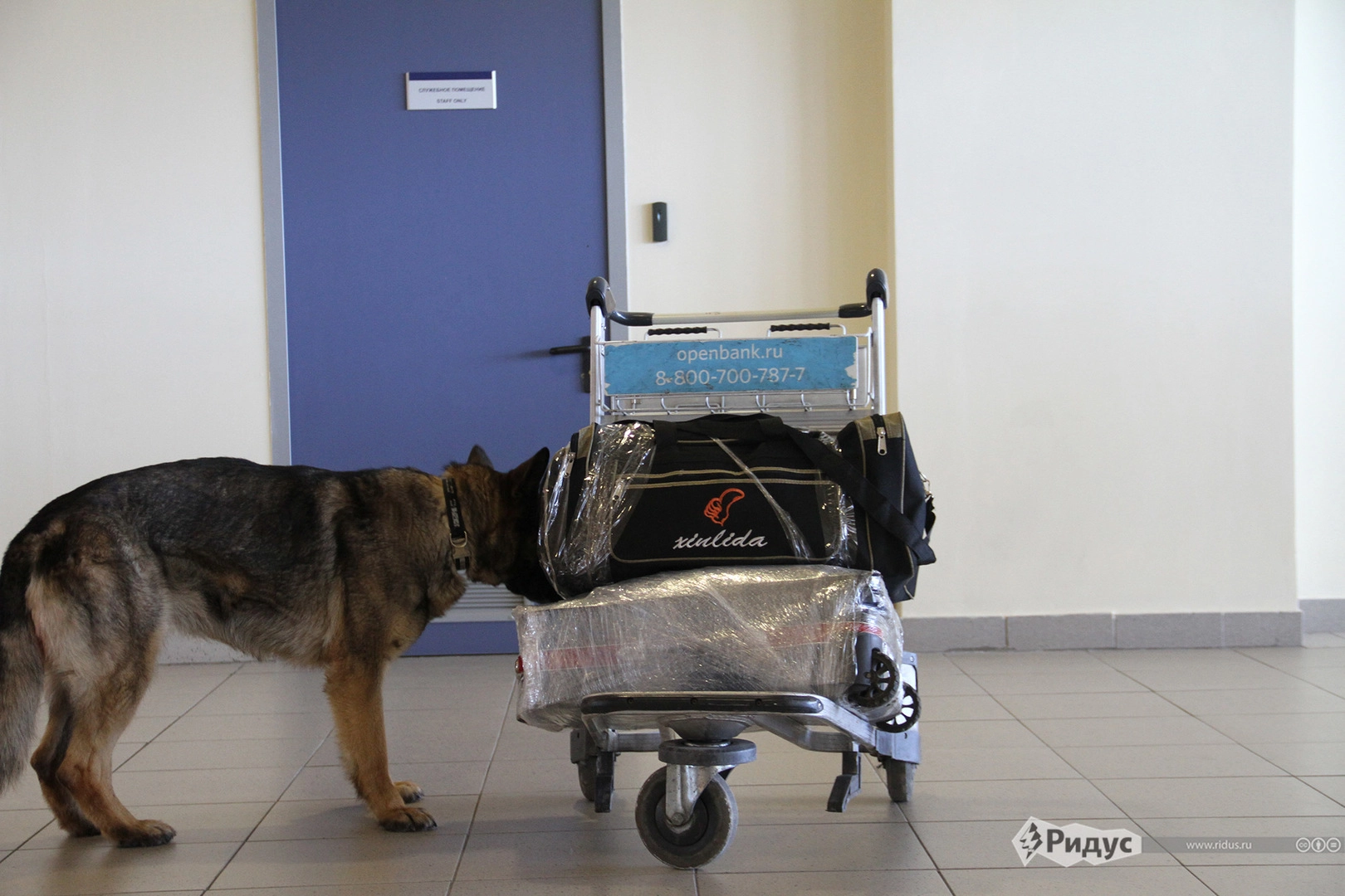 Для чистоты эксперимента проверяем бесхозную сумку. Если бы собака нашла что-то подозрительное, то подала бы условный сигнал, например, села бы рядом, отказавшись отходить от опасного предмета. Но багаж оказался чистым.