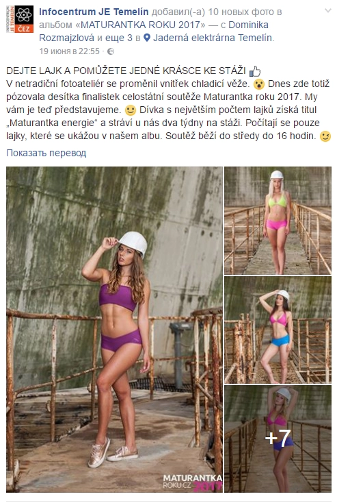 Атомная электростанция «Темелин» в Чехии в Facebook объявила конкурс по набору стажерок. При этом претендентки должны были выслать свои фото в бикини. Чтобы выбрать самых достойных, АЭС открыла голосование. Под откровенным снимком каждой девушки давалось краткое описание их увлечений.