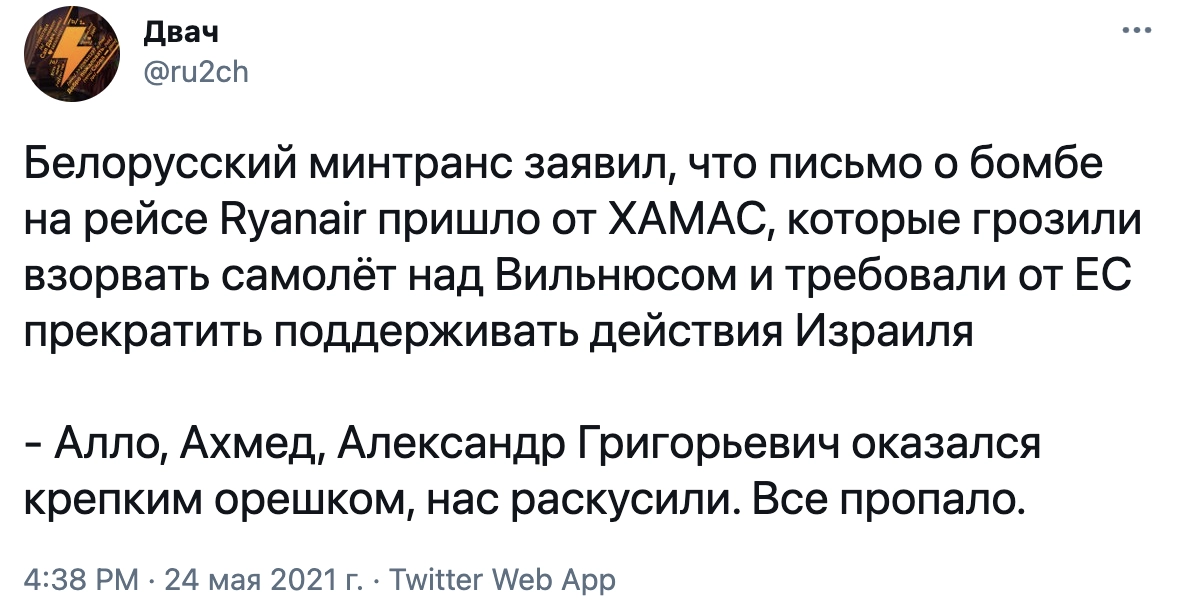 Напомним, 23 мая самолет, летевший из Афин в Вильнюс, совершил экстренную посадку в Минске якобы из-за сообщения о бомбе на борту. В результате был арестован летевший этим рейсом журналист Роман Протасевич, основатель Telegram-канала Nexta, признанного в Белоруссии экстремистским. Против него возбуждено уголовное дело по нескольким статьям, включая статью «организация массовых беспорядков». Ему может грозить наказание до 15 лет лишения свободы или даже смертная казнь.