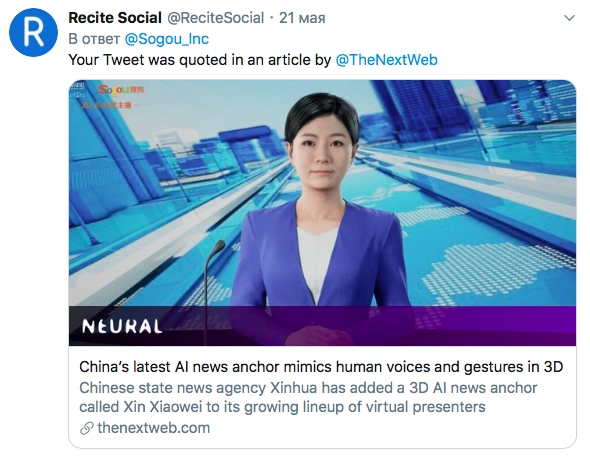 Китайское новостное агентство Синьхуа активно использует современные технологии. Например, в их штате сотрудников есть виртуальные журналисты с искусственным интеллектом.