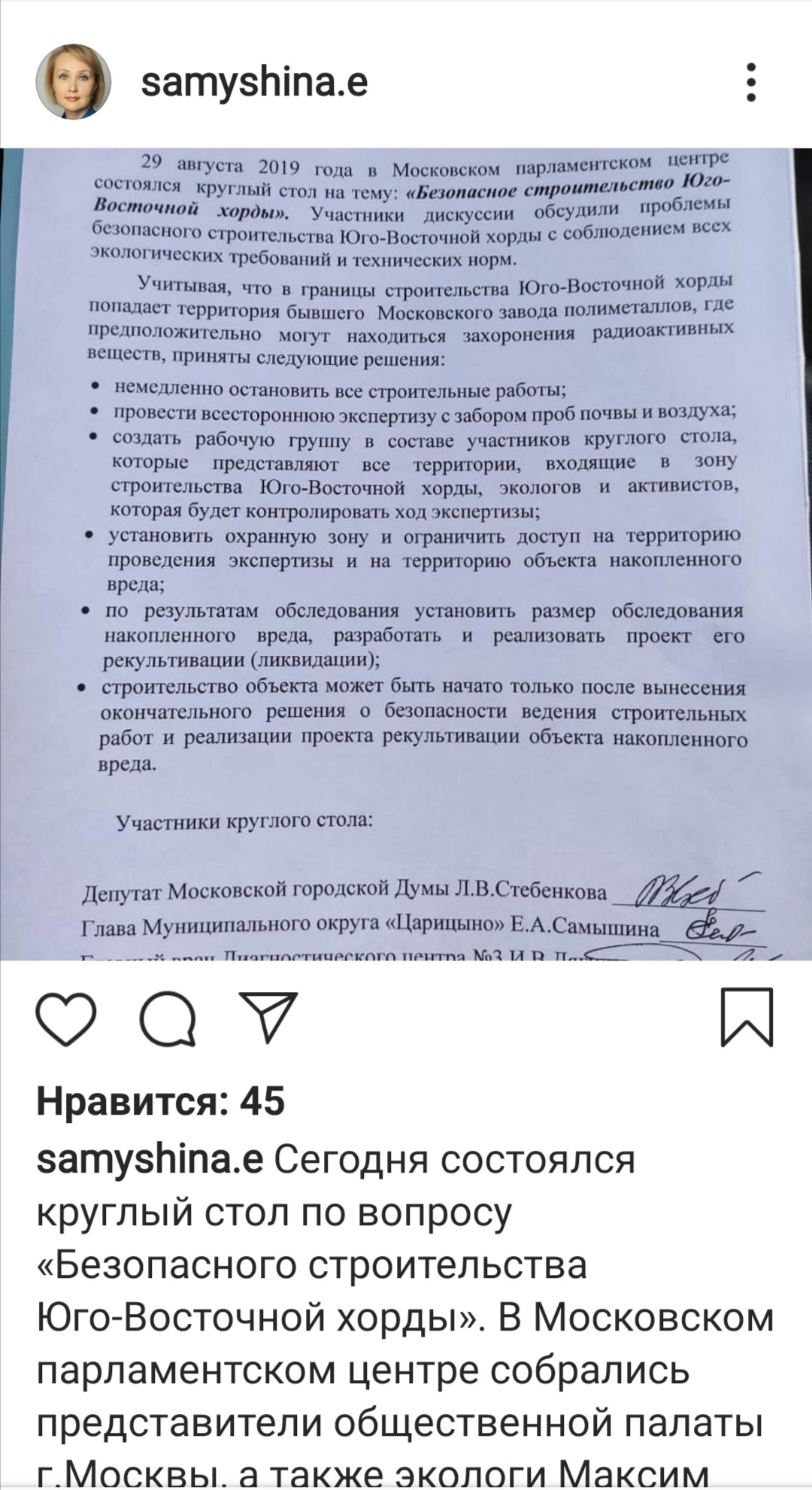 Соратница Стебенковой Елена Самышина, например, буквально на лету переобулась — хоть она и голосовала некогда за строительство хорды на месте «Столичной Припяти», сейчас вдруг резко поменяла мнение. Теперь он требует от властей остановить строительство хорды — твердо и решительно. О чем не преминула сообщить у себя на страницах в соцсетях.