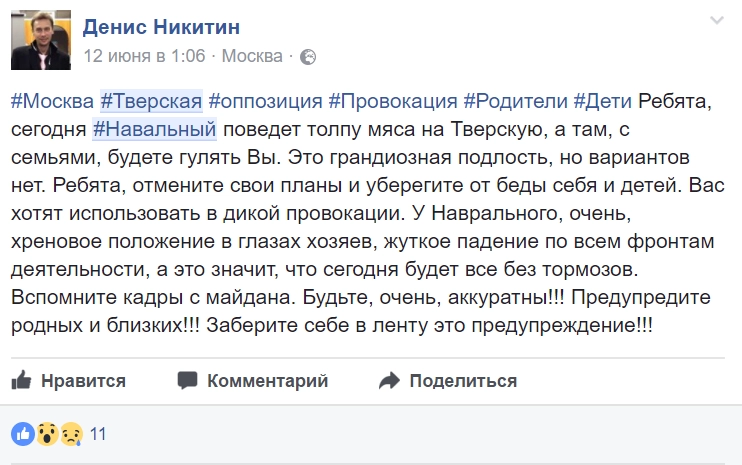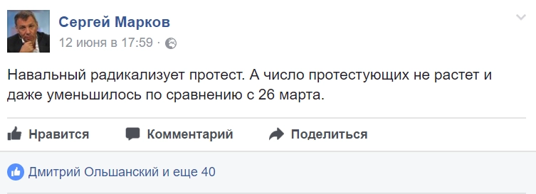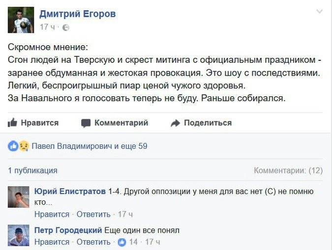 «Мне не нравится, что нынешние активные участники протеста используют те же методы управления массовым сознанием, что и власть. Это говорит о том, что толпа опять же рассматривается как политический инструмент. Тут отсутствует уважение и доверие к обществу. И ко мне в частности, к моей способноcти принимать сознательные решения. Также нагнетается эмоциональная обстановка и это может привести либо к успеху провокаций, либо к серьезным столкновениям. Мне не нравится, что мной пытаются манипулировать, давить на те самые чувства и эмоции, не обещая при этом ничего конкретного и не договариваясь еще на берегу об общих принципах и ценностях», — высказался об акции на Тверской интернет-пользователь Денис Греков.