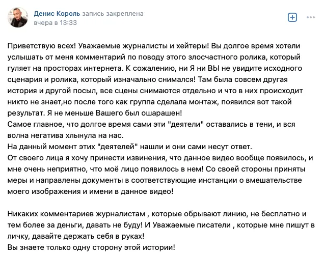 «От своего лица я хочу принести извинения, что данное видео вообще появилось», — сказал Денис Король.