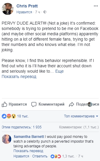 Пратт сообщил, что неизвестный злоумышленник от его имени вступает в соцсетях в переписку с поклонницами актера с целью получения от них личной информации, номера телефона и, возможно, чего-то еще.