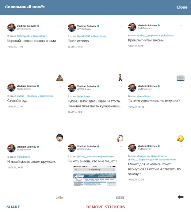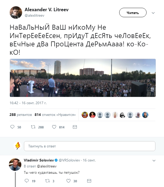 Пользователь Twitter Александр Литреев, который является специалистом по кибербезопасности и активистом Фонда борьбы с коррупцией, опубликовал снимок с митинга Навального. Он обратился к Соловьеву и припомнил ему скандальное высказывание о некоторых россиянах как о «двух процентах дерьма».