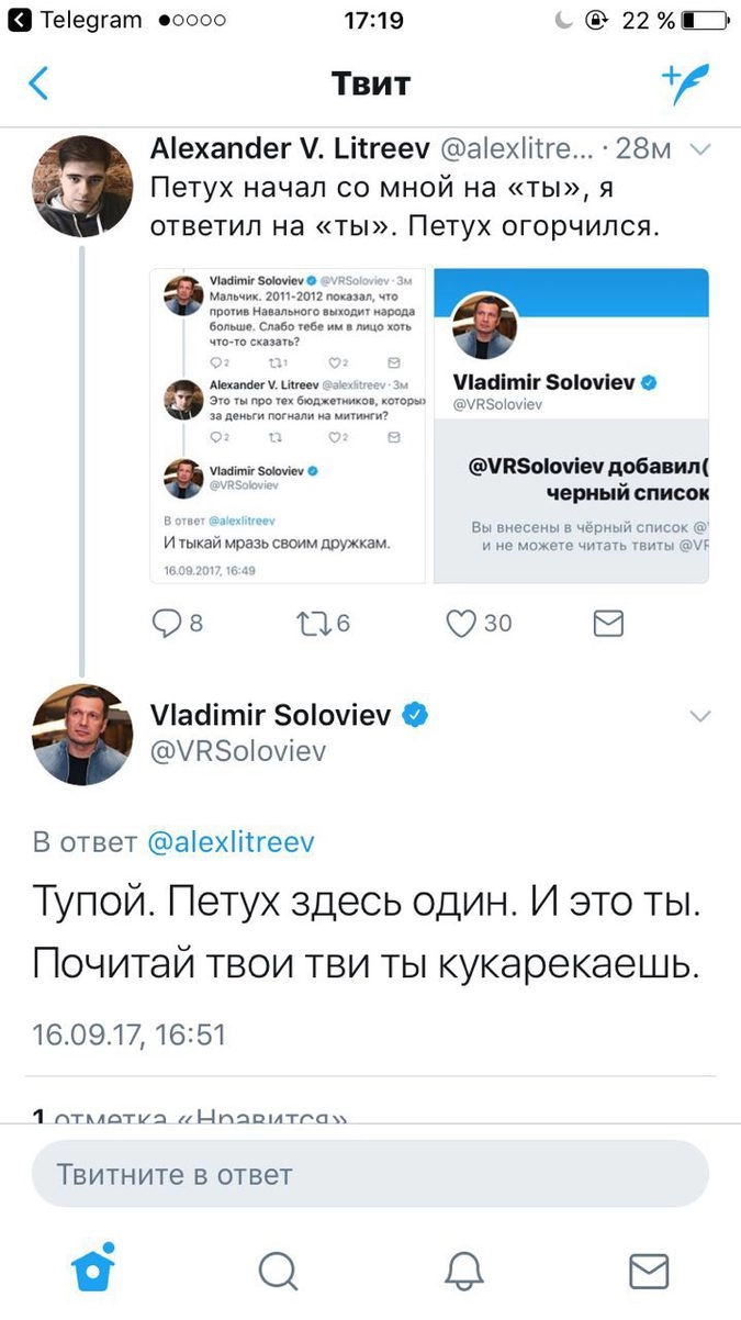 Твит Литреева не остался незамеченным Соловьевым. В ответ он назвал пользователя петушком, а затем и мразью. Сторонник Навального пригрозил телеведущему судом.