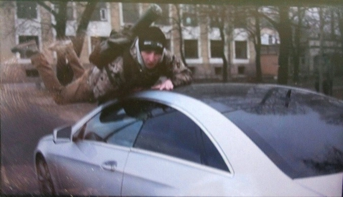 Активисты постучали в окно иномарки, чтобы вызвать водителя на разговор, но он начал снова ехать, при этом якобы не обращая внимания на стоящего на его пути человека. В итоге общественники наклеили на автомобиль фирменную наклейку своего движения, чем заставили водителя выйти — из автомобиля и из себя, да так, что он разбил их видеокамеру.