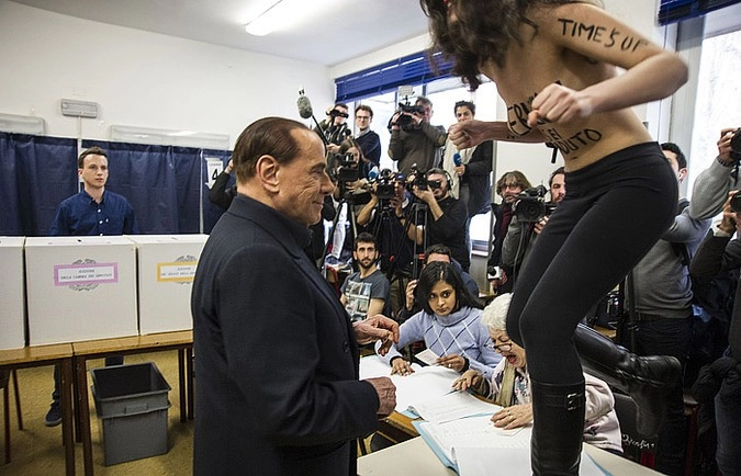 Раздетая по пояс активистка движения Femen вскочила на избирательную урну вскоре после того, как 81-летний Берлускони опустил в нее свой бюллетень. Происшествие было запечатлено на видео.