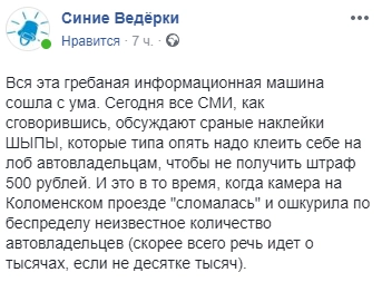 Активисты российского общественного движения «Синие ведерки» поделись на своей странице в Facebook возмущенным постом по поводу сломанной камеры на Коломенском проезде в Москве.