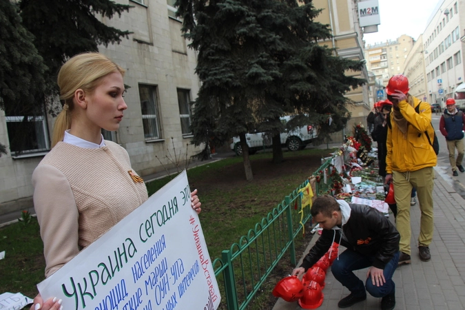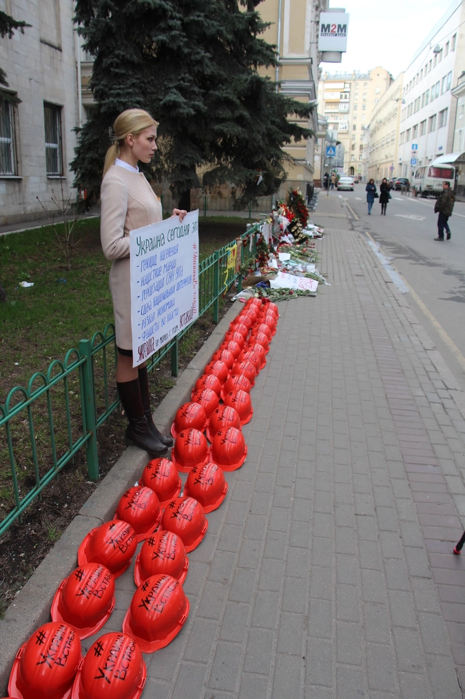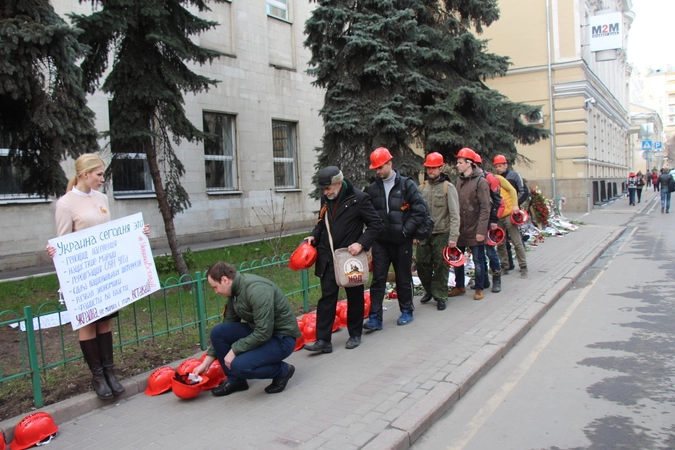 24 апреля к посольству Украины в Москве пришли активисты Национально-Освободительного движения (НОД), чтобы поддержать требования украинских шахтеров, выступивших против террора киевских властей.