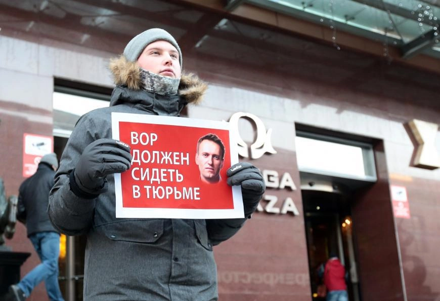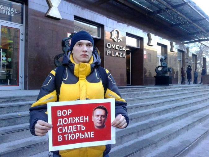 Активисты общественного движения «Антимайдан» продолжают серию одиночных пикетов у офиса Фонда борьбы с коррупцией в столице России. Как и на минувшей неделе, в руках демонстранты держат неизменные плакаты с портретом Алексея Навального и лозунгом «Вор должен сидеть в тюрьме».