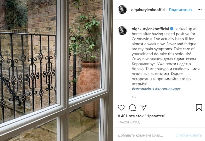 «Заперли дома после положительного результата теста на коронавирус. Я уже почти неделю болею», — написала Куриленко.