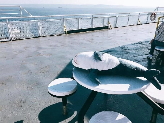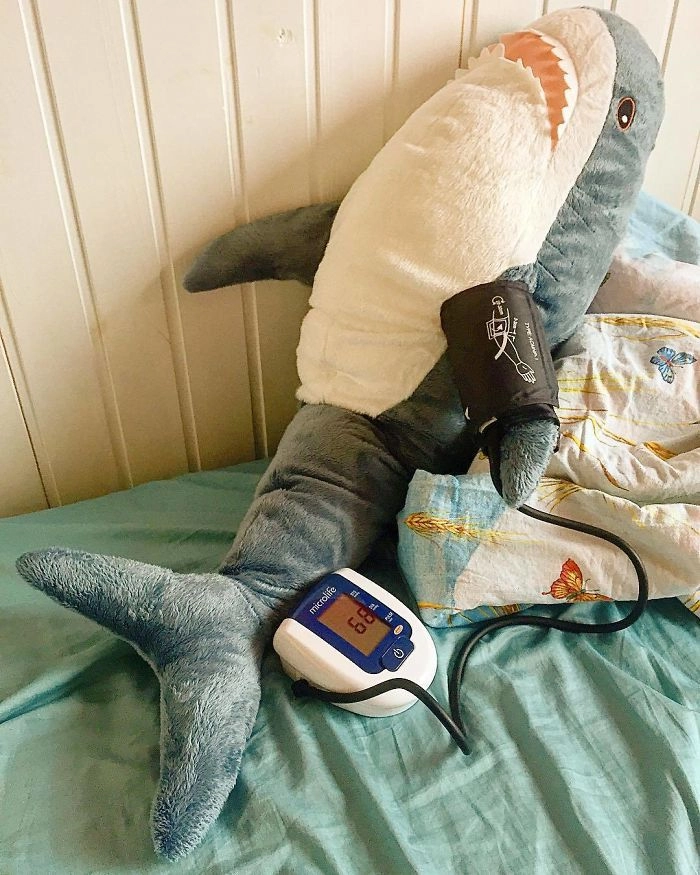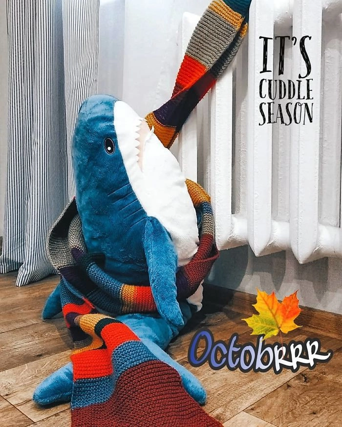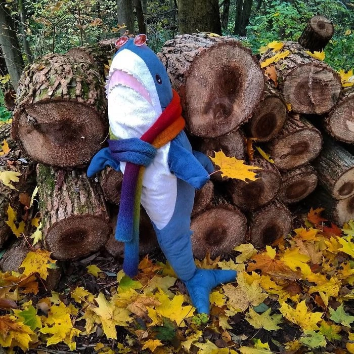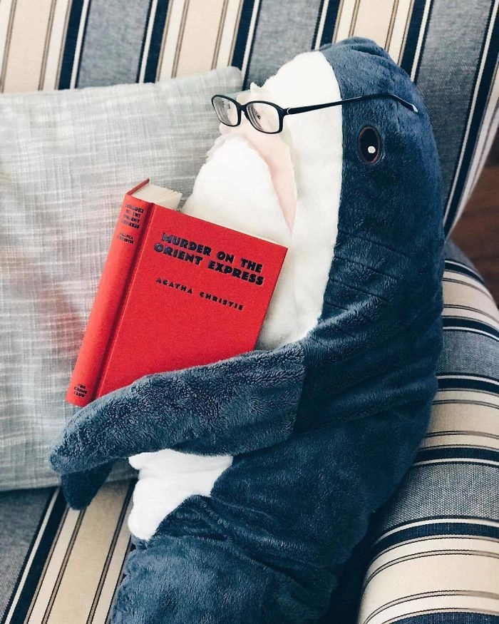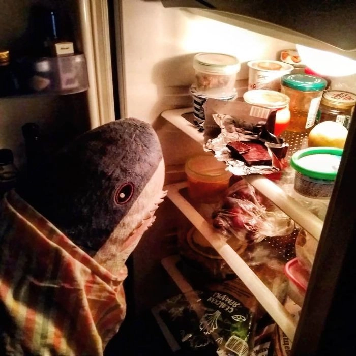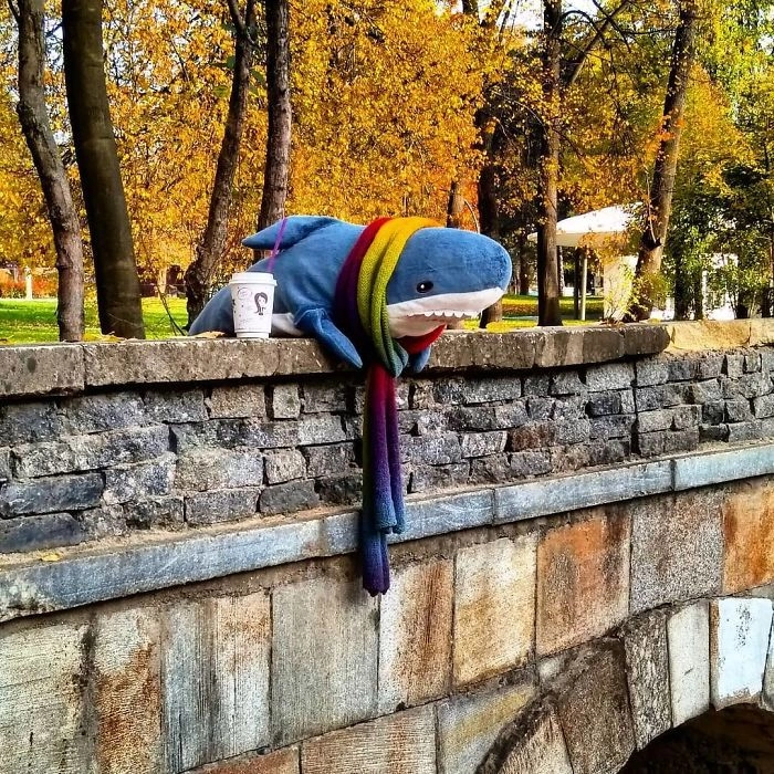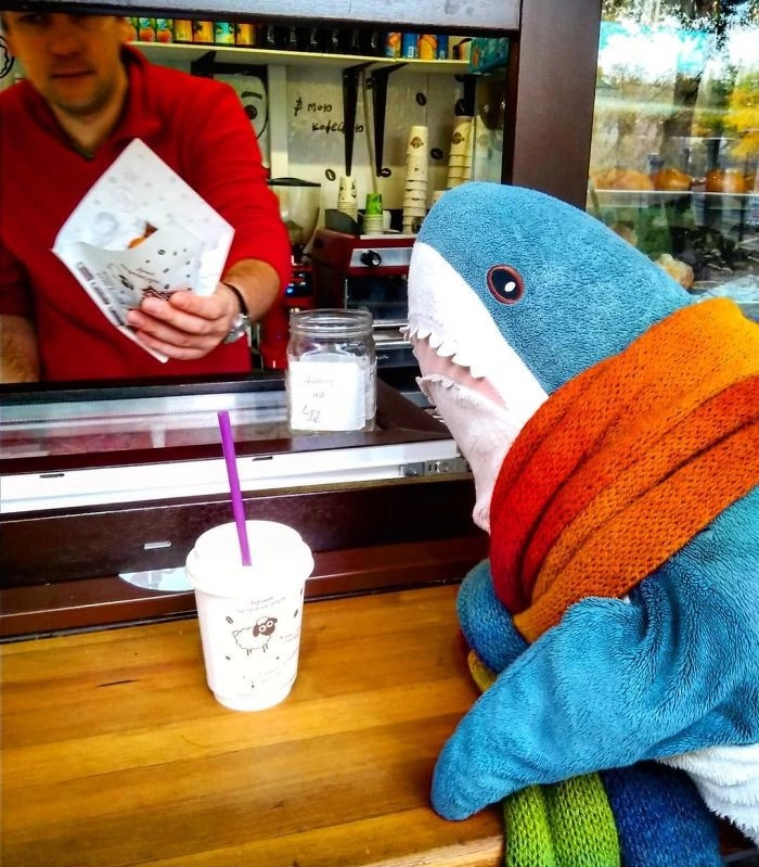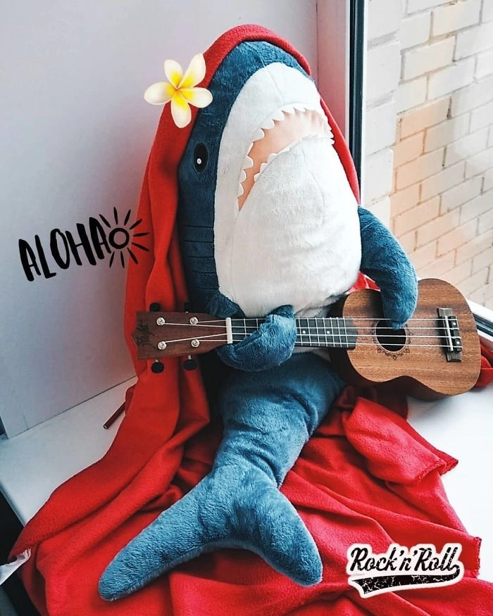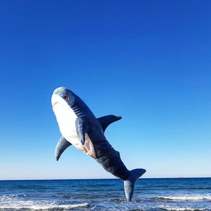 Началось всё с того, что кто-то выложил в соцсети фотографию, на которой голубая хищница как будто пьёт сок, сидя за кухонным столом. После этого люди стали один за другим публиковать снимки виртуальных приключений игрушки — вот акула Блохэй (Blåhaj) читает газету, слушает музыку, катается на автомобиле, а вот загорает на пляже и даже флиртует с барменом.
