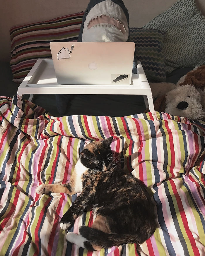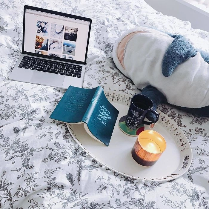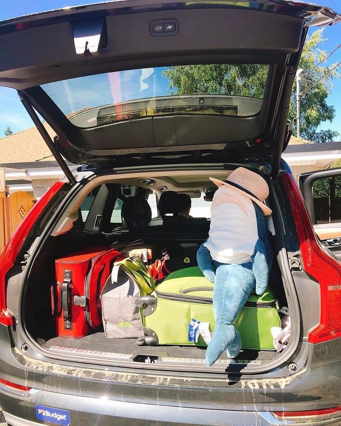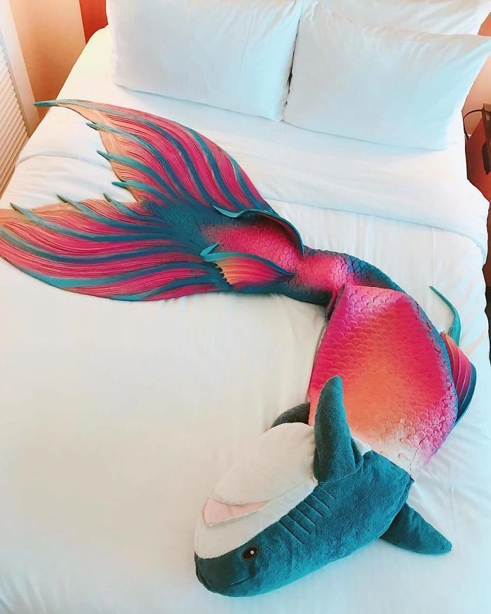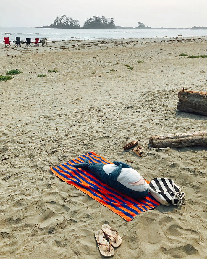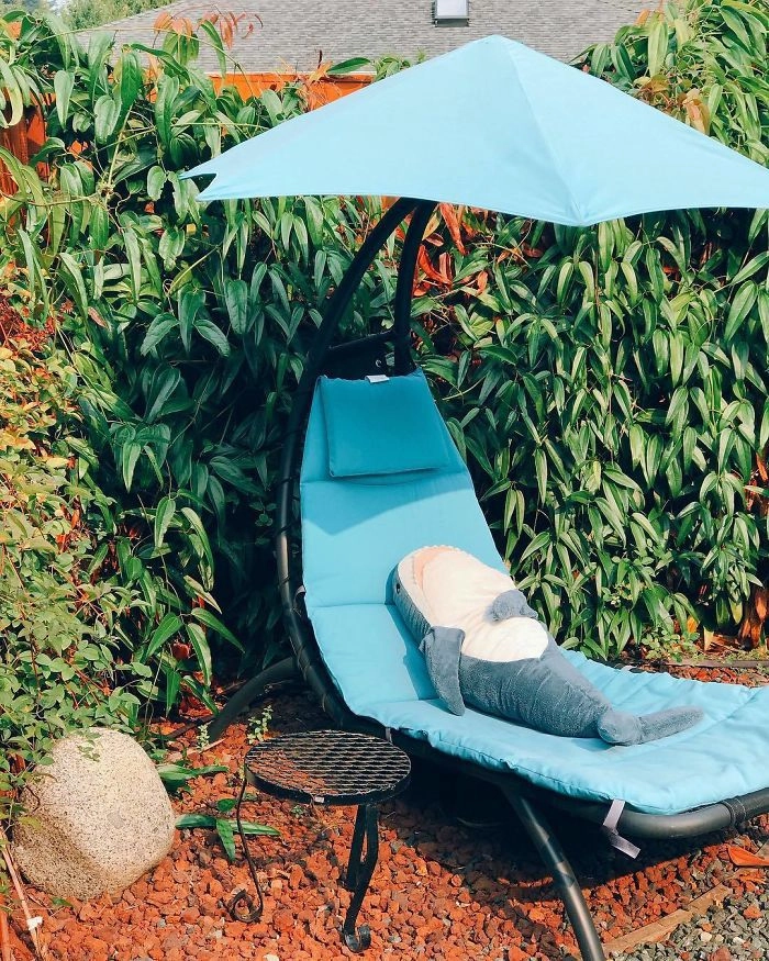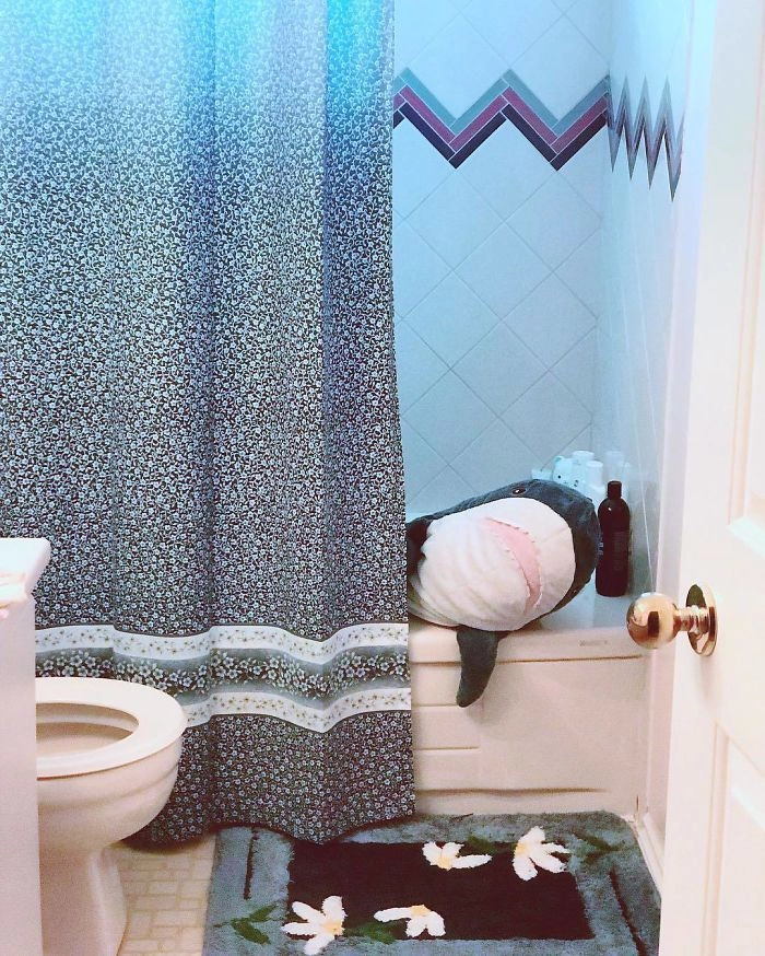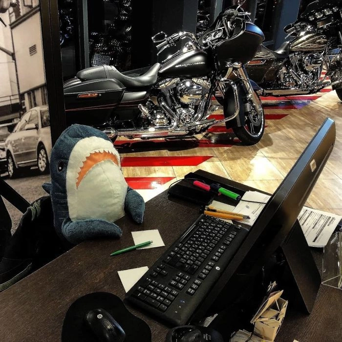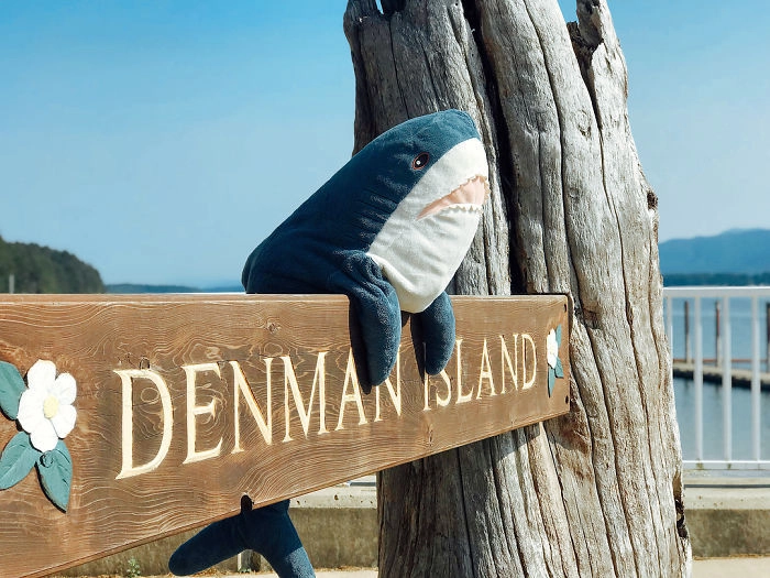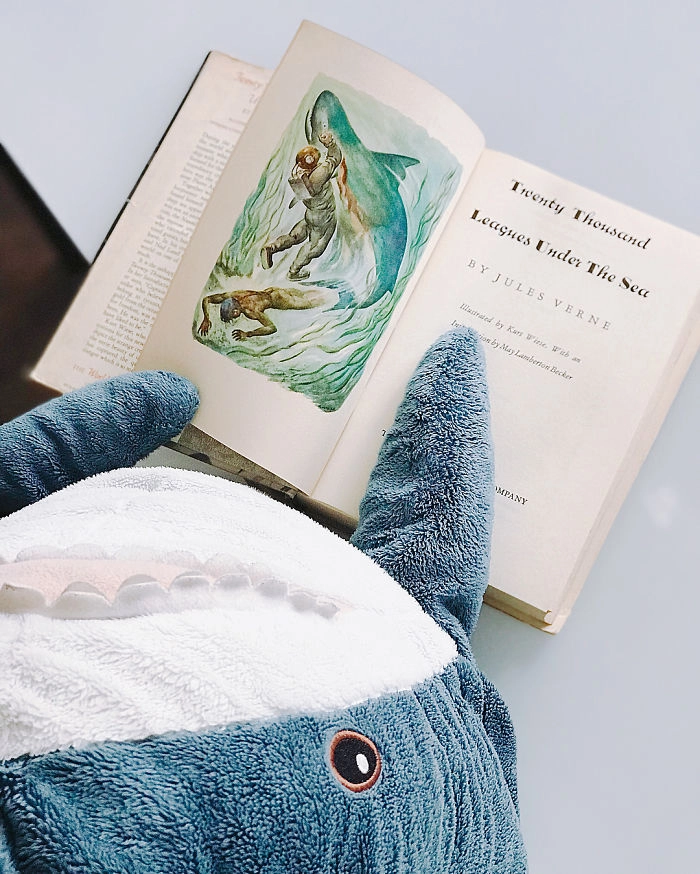 Началось всё с того, что кто-то выложил в соцсети фотографию, на которой голубая хищница как будто пьёт сок, сидя за кухонным столом. После этого люди стали один за другим публиковать снимки виртуальных приключений игрушки — вот акула Блохэй (Blåhaj) читает газету, слушает музыку, катается на автомобиле, а вот загорает на пляже и даже флиртует с барменом.
