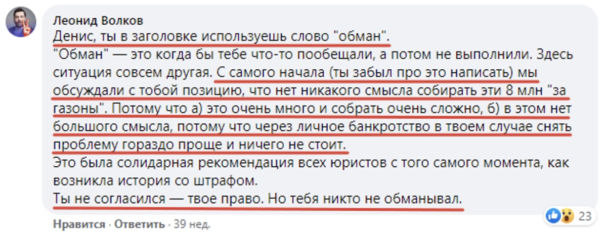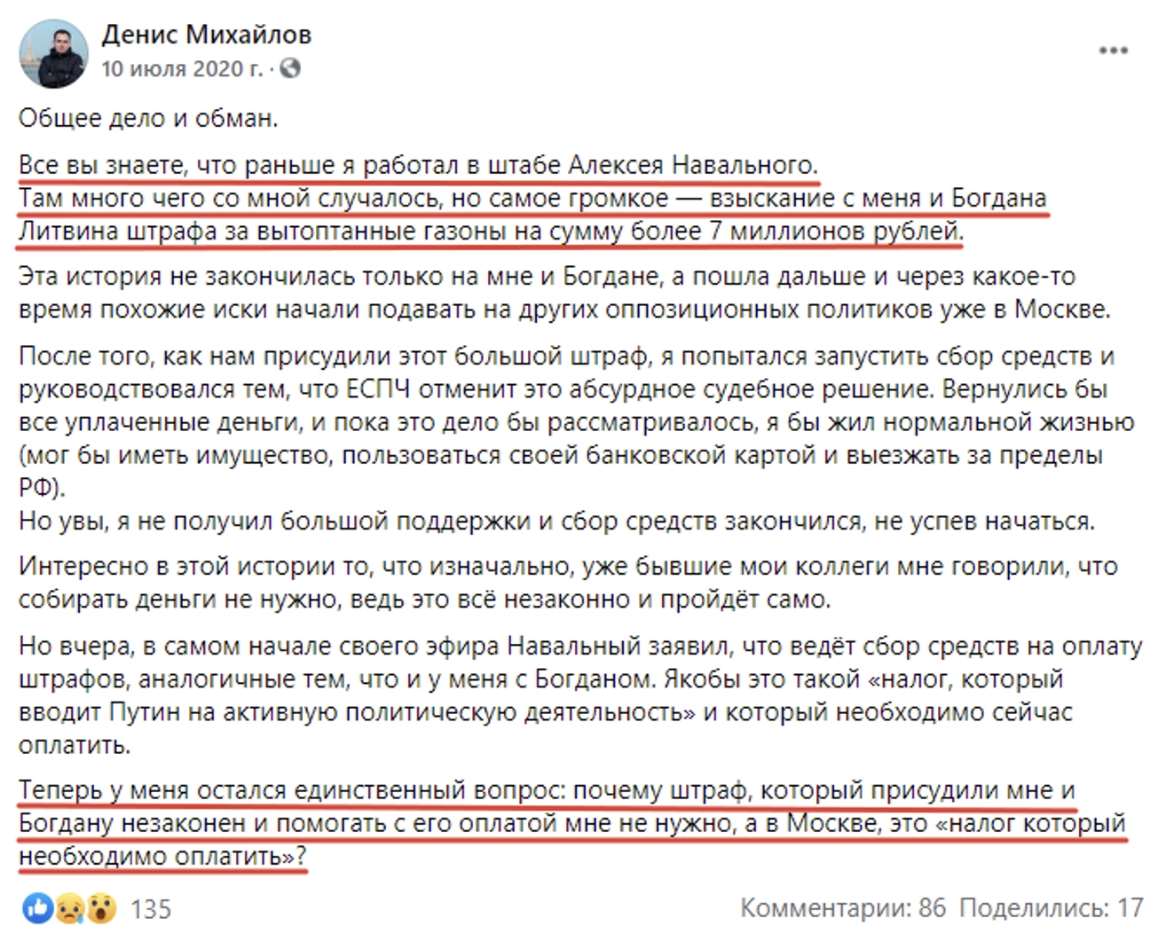 Ранее в похожую ситуацию попал координатор штаба Навального в Санкт-Петербурге Денис Михайлов. Он был оштрафован на семь миллионов рублей за порчу зеленых насаждений во время протестных акций 2018 года и тоже очень нуждался в деньгах, поскольку человек он, как известно, небогатый. Однако Албуров и прочие близкие соратники Алексея Навального отказали Михайлову в проведении кампании по сбору пожертвований на компенсацию штрафа.