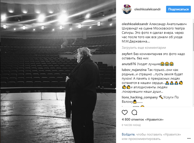 «Александр Анатольевич Ширвиндт на сцене Московского театра сатиры. Это фото я сделал вчера, через час после того, как все узнали об уходе М. М. Державина…» — написал в соцсети Олешко.