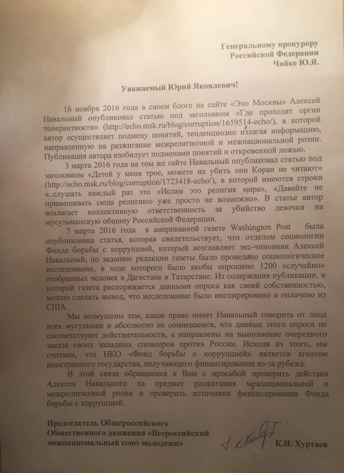 Инициаторы обращения просят генпрокурора РФ «проверить действия Алексея Навального на предмет разжигания межнациональной розни и проверить источники финансирования Фонда борьбы с коррупцией.