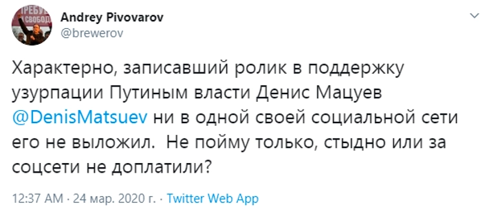 Основатель Фонда борьбы с коррупцией Алексей Навальный организовал в Сети травлю артистов и прочих деятелей культуры, которые поддержали предложенные президентом РФ Владимиром Путиным конституционные поправки. В этой кампании приняли участие такие оппозиционеры, как Геннадий Гудков, Андрей Пивоваров, а еще многие рядовые пользователи, симпатизирующие Алексею Навальному.