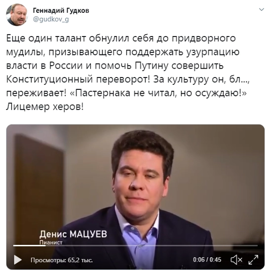 В частности, объектами нападок стали пианист Денис Мацуев, актеры Сергей Безруков и Владимир Машков.