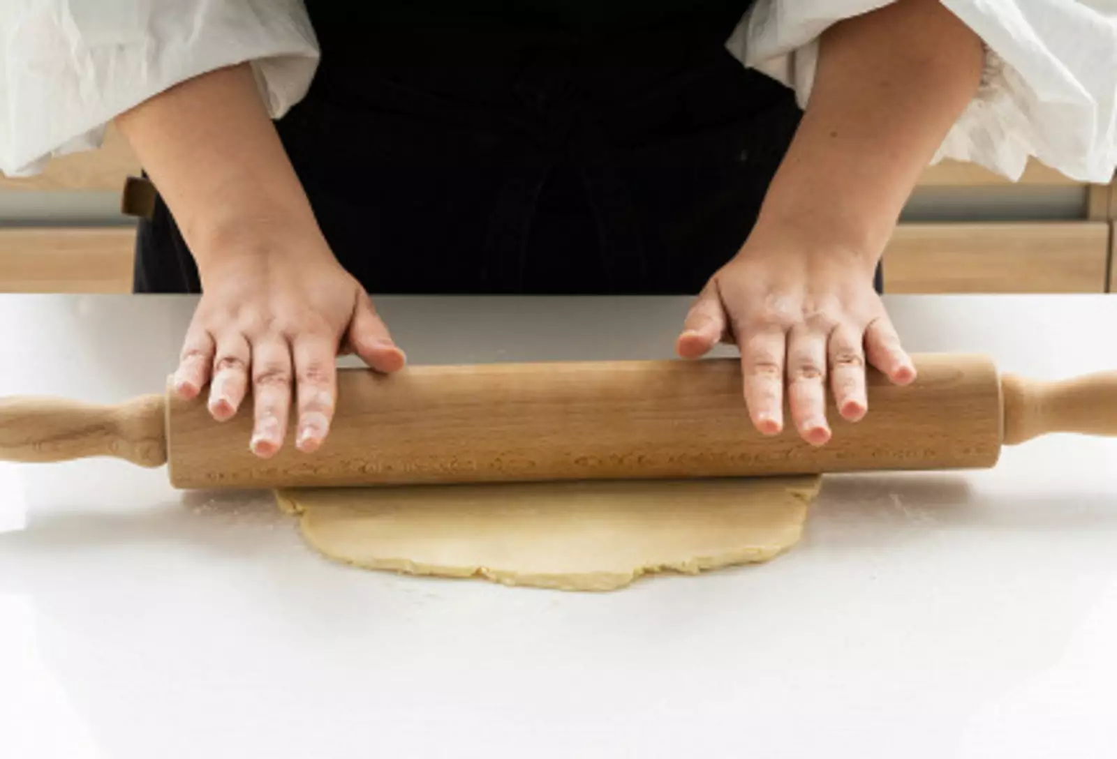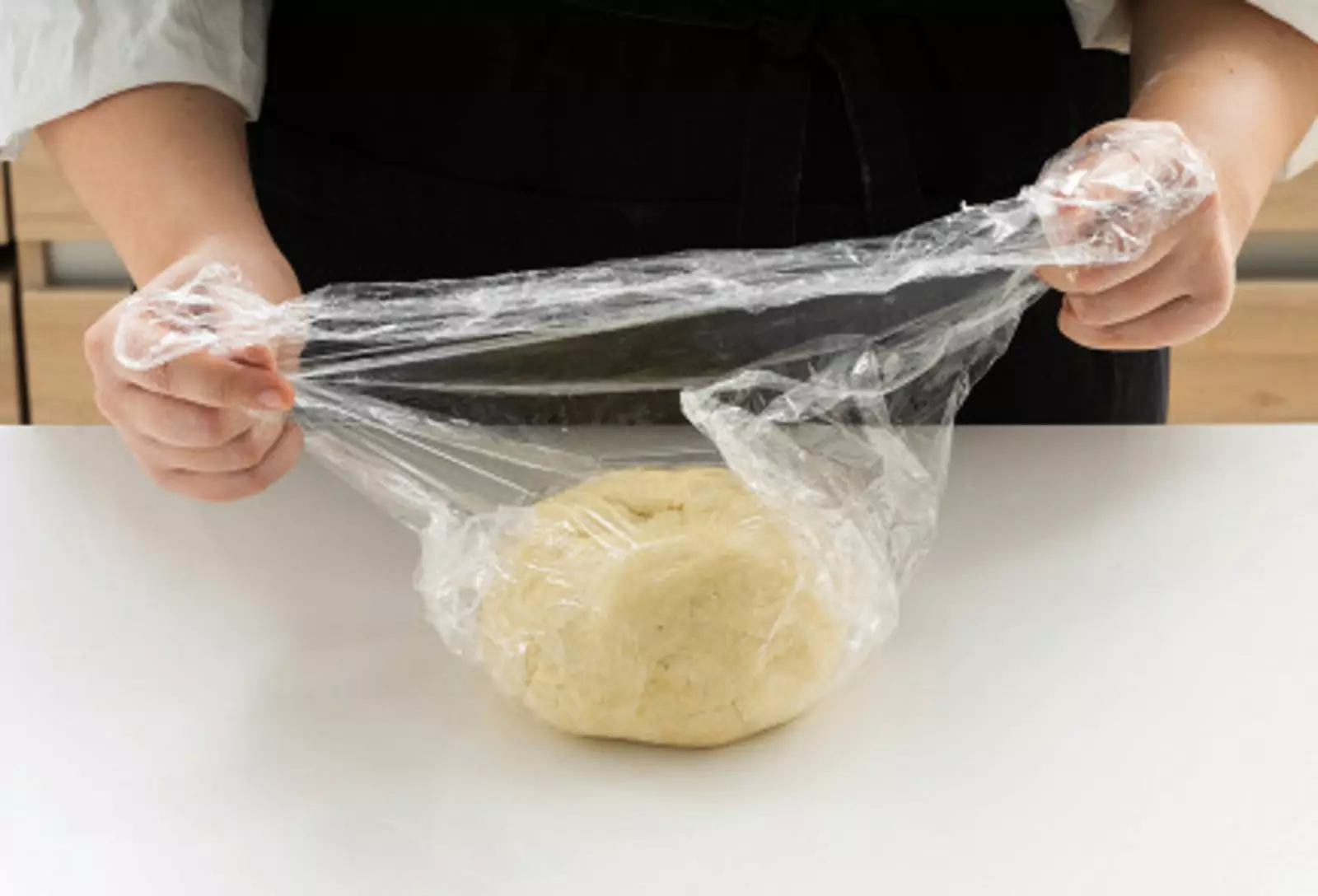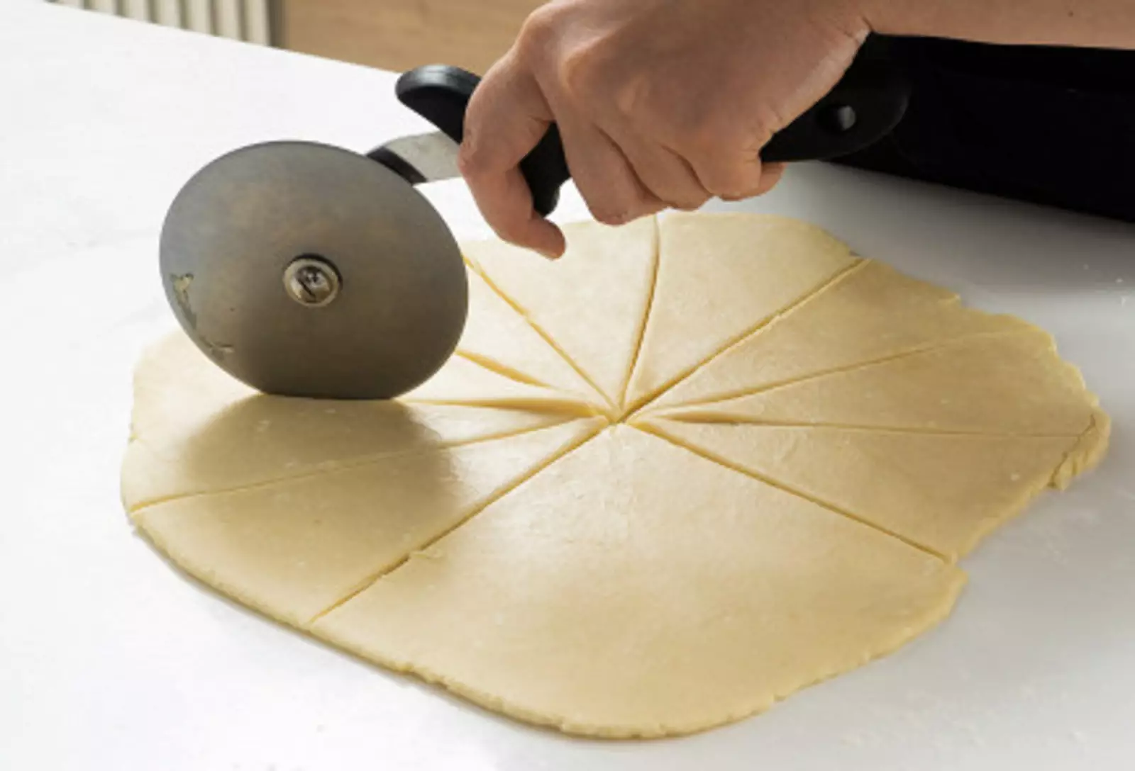 5. Достать тесто из холодильника. Разрезать его на две части, первую убрать обратно в холодильник, вторую раскатать в ровный круг.
