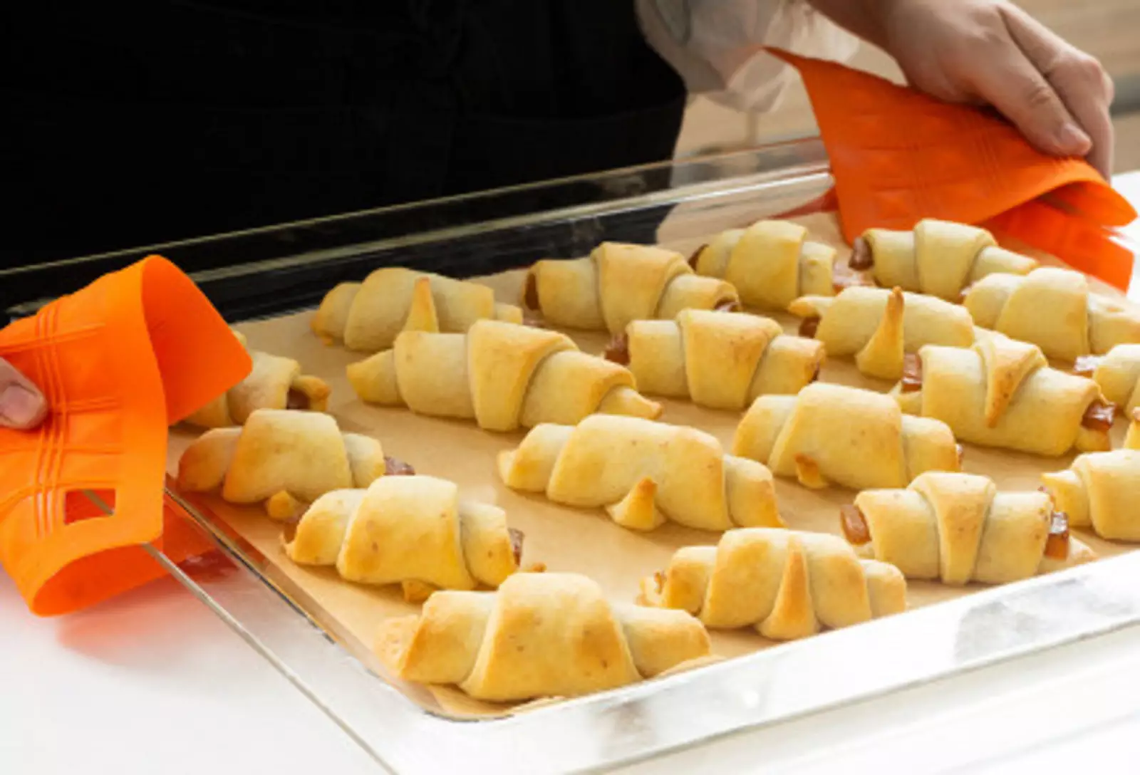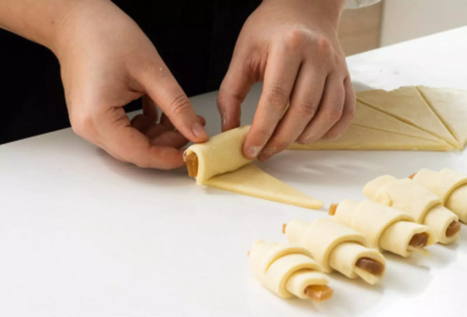 7. На широкий край положить кусочек мармелада и завернуть. Проделать то же самое с остальными сегментами.