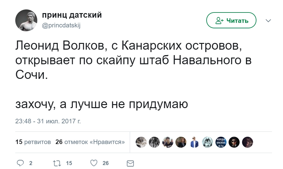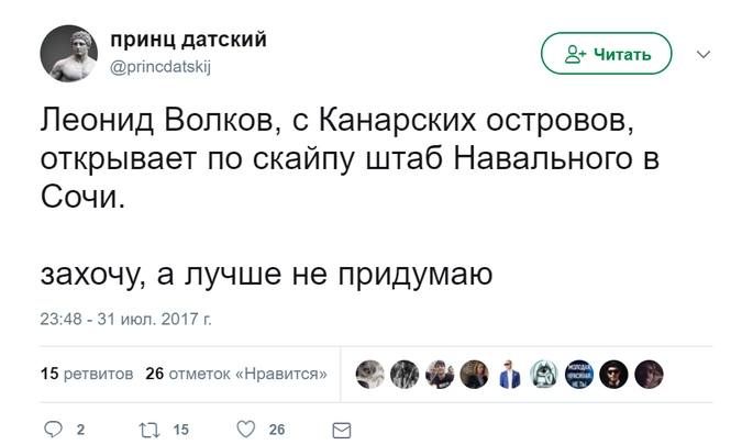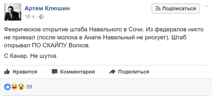 «Привет вам с моря! Я сегодня, так получилось, по некоторым делам Фонда борьбы с коррупцией на Кипре», — объявил Волков пришедшим на открытие штаба сторонникам Алексея Навального через видеотрансляцию Skype.