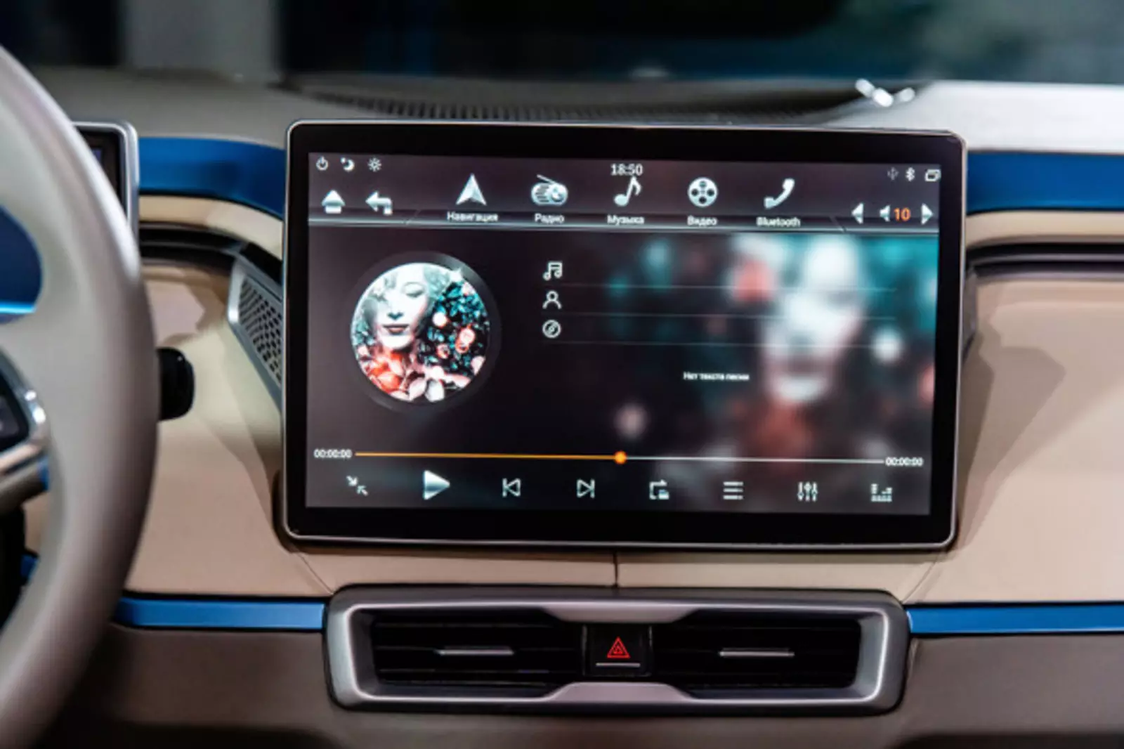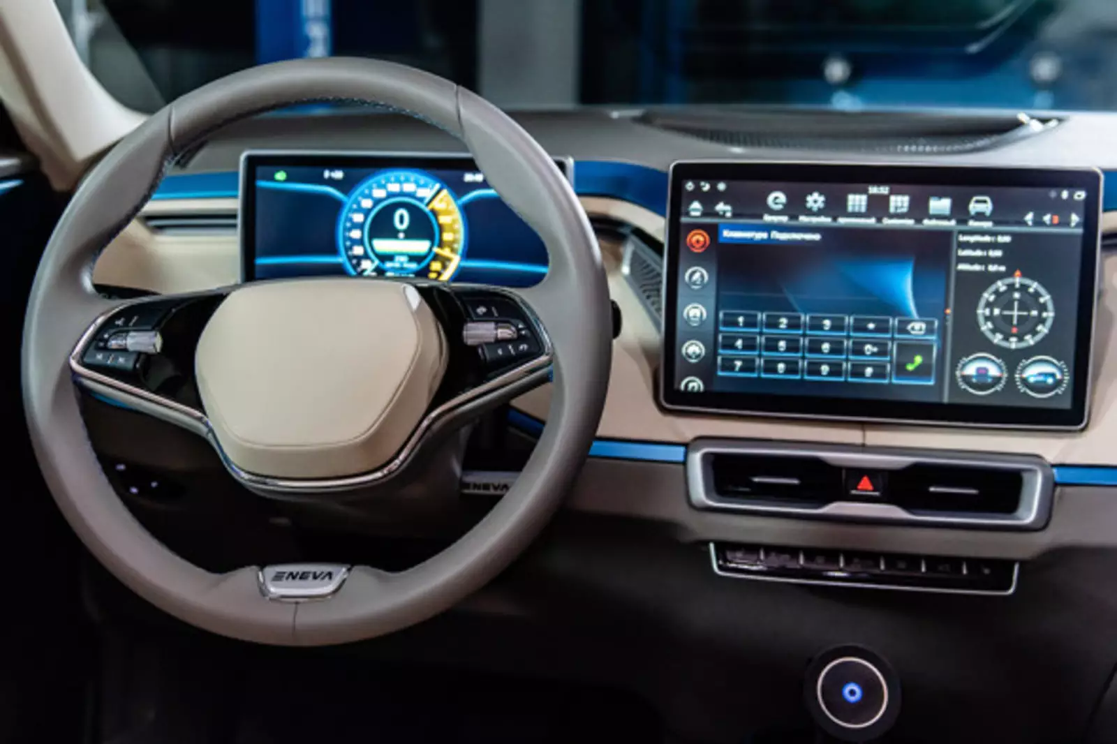 В оснащение E-NEVA входит современная мультимедийная система, цифровая панель приборов, проекционный дисплей на лобовом стекле и сенсорный экран диагональю 15 дюймов.