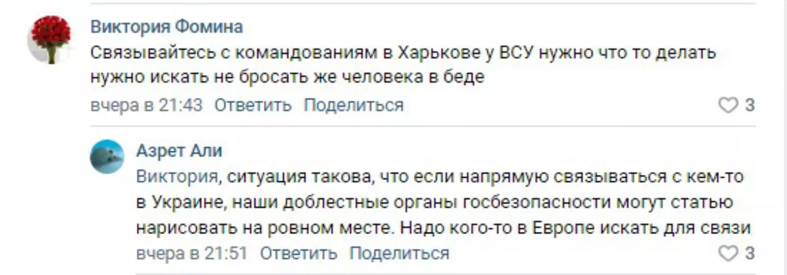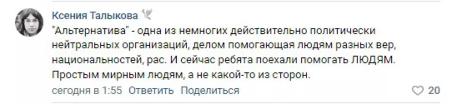 «Уже неделю не выходит на связь — ни машины, ни следов. Возили гуманитарный груз из Валуйки (Белгородская область) в Купянск (Харьковскую область). Грузы он возил не от лица „Альтернативы“, а по своей инициативе, как частное лицо. Два наших человека уже поехали их искать, но никаких результатов», — рассказал «Ридусу» участник движения Алексей Никитин.