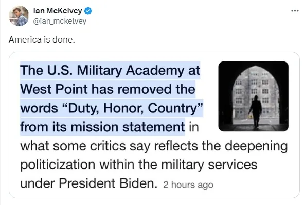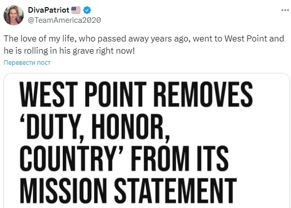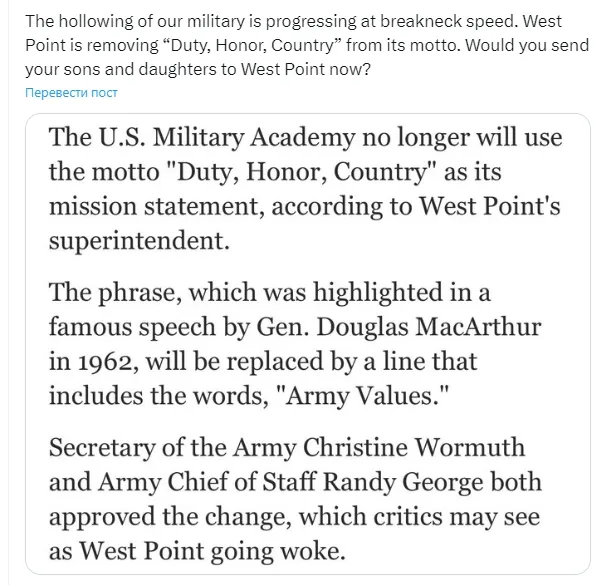 Как сообщает Washington Times, критики обвиняют руководство Вест-Пойнта в следовании «прогрессивной повесточке», а в отказе от проверенного временем девиза видят признаки «политизации вооружённых сил при администрации Байдена». Социальные сети уже наполнились негодующими комментариями по поводу решения военной академии.