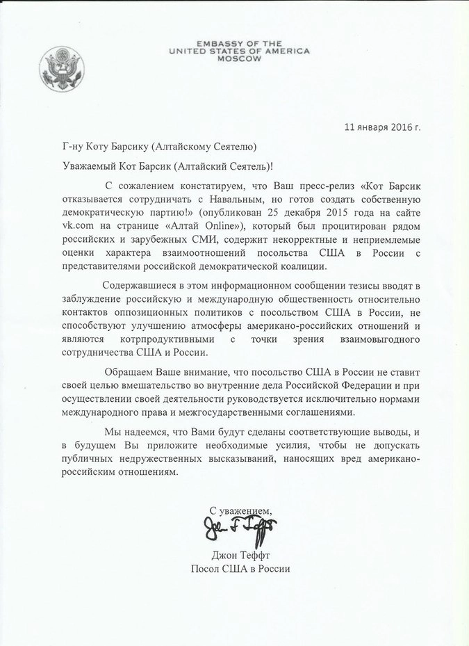 В Интернете появилось письмо из посольства США, адресованное коту Барсику, которого пользователи соцсетей недавно окрестили «народным мэром» Барнаула. Поводом для обращения заокеанских дипломатов к Барсику послужило прошлогоднее «заявление» животного для СМИ под заголовком «Кот Барсик отказывается сотрудничать с Навальным, но готов создать собственную демократическую коалицию».